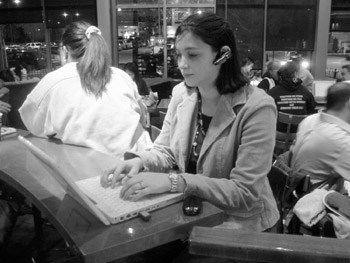 As he sipped his hot chocolate and stared at his screen, Jake waited anxiously for an indication that Monica was in the area. Roughly three minutes earlier than usual, she arrived at the café. In typical fashion, she carried her laptop under her arm. Being this close, Jake could now see the little D-Link Bluetooth dongle that had made his virtual introduction to Monica possible.