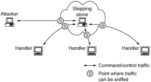 Most sites will fall into this category, since there are typically far more compromised hosts used as agents than there are handlers, stepping stones, or victims (usually combined). A site hosting agents has a responsibility to identify and clean up the compromised hosts, lest they be used over and over for continued attacks. At sites with small incident response teams, or none at all, the typical cleanup is "wipe the drive, reinstall the OS, get back online." As discussed in Section 6.5, this has potential negative consequences. One consequence is that, unless you also patch the system to current levels, you will be placing the same vulnerability back on the system and it will be compromised again. Another is the destruction of evidence. At least some data collection and preservation is typically warranted in the case of large attacks. A better response is to restore the system from a recent, known clean backup that already has software patches installed. Alternatively, do the operating system installation and patching from CD-ROMs you have prepared while the system is disconnected from the network entirely. Ask the vendor or distributor of your operating system of choice how to produce a patch CD-ROM for such use. Windows users can try things like Microsoft's Security Readiness Kit (found at http://www.microsoft.com/technet/security/readiness/default.mspx), or if you are using Red Hat Linux, by downloading and creating CDs from the packages in their errata Web pages http://www.redhat.com/errata/. Doing less than that can expose newly cleaned machines to repeated intrusions, sometimes nearly immediately. (Note that if you have a PC on the network of a large Internet 2 educational site, and you try to install a Windows 2000 or XP system from the original CD-ROMs distributed with your computer dating prior to 2003, that system has a high probability of being infected with W32/Blaster, Nachi, or some other currently active worm or bot in less than one minute, that is, before the installation is even complete!) In some cases, the command and control traffic would expose all of the agents in the DDoS network. In other cases, DDoS handlers keep track of all the agents within a file. Knowing that your site is hosting agents, you can identify the victim and assist them in identifying all of the agents in the DDoS network by monitoring traffic at their site, and you can assist the site hosting the handler in recovering information about a large percentage of the agents and perhaps take down the entire network. Working with the site hosting the handler also gets one hop closer to the attacker. Moving now to the site hosting the handler, one can capture only command and control traffic. The traffic rate will be much lower, and the view of the agents in a DDoS network provides more information because the handler communicates with agents at numerous sites. The view from the site hosting the handler is depicted in Figure 6.6. Figure 6.6. Illustration of control traffic seen from site hosting a handlerNote that now both parts of the command and control traffic are visible: the connection from the attacker to the handler's user interface, as well as the traffic to/from a set of agents. Capture all packets to and from the handler, including the data portion of packets (not just headers). Keep these logs secure. If the attacker is not using an encrypted channel, you also get to see the passwords, user account names, and command syntax of the DDoS tool. This alone may give you enough information to determine what tool is in use, just from watching traffic from outside the handler. Host-level forensics are also an option here for recovering even more information, and preservation of evidence should be carefully done in the event that law enforcement is involved later in the process. Note that you should consider very, very carefully any actions that would take control of the DDoS network in any way. The best advice is to get law enforcement involved as soon as you understand how the DDoS network functions and provide a report to them. You also want to attempt to identify the stepping stones used for incoming connections to the handler. Keep track of all of them, and determine if there is more than one IP address or network block that is favored by the attacker. What time of day are connections most often made? Identify the sites involved, and very carefully attempt to contact them, perhaps by going through their upstream providers, to make sure that you do not end up reporting the DDoS network to the attacker or one of her friends! If you get cooperation from the other sites, they can then attempt to identify other upstream stepping stones, and maybe even other handlers in the network (or networks) being used by the attacker. Now we will look at the site that is hosting the stepping stone. Here we have only a partial view of the command and control traffic between the attacker and the handlers. There is no more visibility beyond the handlers to agents. This is illustrated in Figure 6.7. Figure 6.7. Illustration of control traffic seen from site hosting a stepping stone