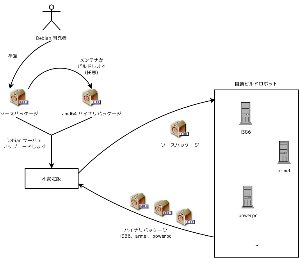 ユーザはバグに遭遇すると、バグをパッケージメンテナに報告します。メンテナは定期的に修正済みバージョンを用意し、ftp-master.debian.org サーバにアップロードします。