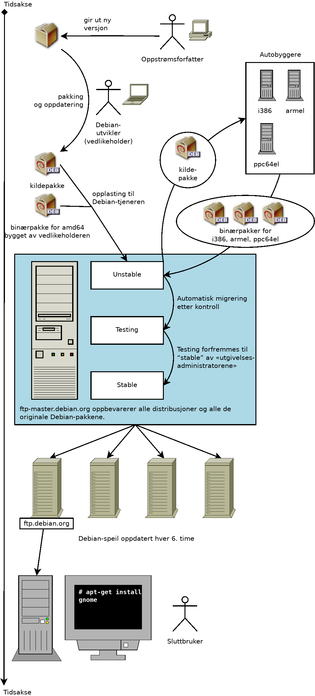 . La oss gå tilbake til tilfellet med en typisk pakke. Utvikleren skaper den første pakken, som de bygger for Unstable-versjonen, og legger den på ftp-master.debian.org-tjeneren. Dette første steget involverer inspeksjon og godkjenning fra FTP-mestrene. Programvaren er deretter tilgjengelig i Unstable-distribusjonen, som er «blodfersk»-distribusjon. Det er brukere som er mer opptatt av å ha oppdaterte pakker, enn av fare for alvorlige feil som velger denne distribusjonen. De vil finne ut mer om programmet, og deretter teste det.