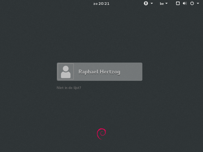 Als je de taak “Debian desktop omgeving” geactiveerd hebt zonder een expliciete keuze voor de desktop (of met de “GNOME” keuze), zal de computer het gdm3 login manager weergeven.