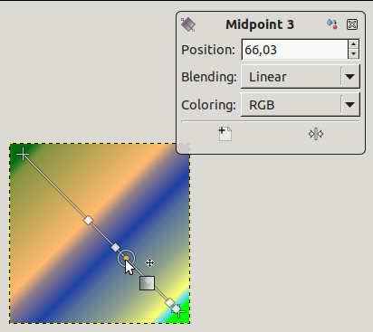 Sulla linea si possono osservare diversi piccoli quadratini. Questi sono Stop che dividono il gradiente in segmenti. I segmenti possono essere modificati separatamente. Fare clic e trascinare gli stop per spostarli (il capo attivo diventa di colore giallo). Non appena si sposta uno stop, viene creato il gradiente personalizzato. La piccola finestra dati mostra un pulsante che permette di rimuovere lo stop attivo.