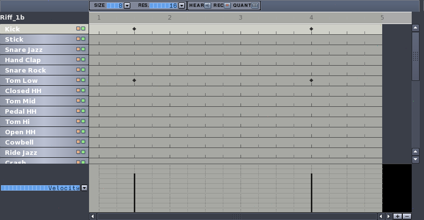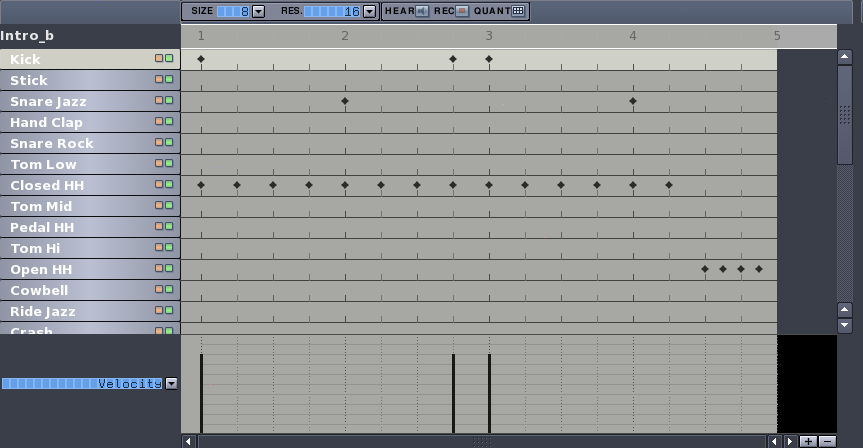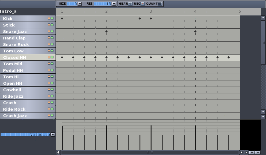 The base pattern (Fig. 1 and 2) is 4 bars long (divided in 2 different bars, each repeated 2 times, so it's [2a*2]+[2b*2]) and lasts for the whole song, from the beginning to the end, riff included; most of the time (intro and riff excluded) this base pattern is repeated 2 times to reach the commonly used 8 bars for each part of the song (A,B,C). Before starting let's set the speed to 98bpm (HINT HINT you can find out by yourself the speed of the song while playing it with your favourite media player and following the rhythm by clicking repeatedly the backslash key in Hydrogen) and from the menu Grid Resolution let's set '16'. To create a new pattern select the instrument Closed HH, click on RMB and choose Fill Notes: the first two bars will be filled up. Then insert manually the beats on Snare Jazz and Kick as indicated in the 2 pictures below and there we have the base pattern for our song. Note how the beats on the hi-hat have different 'hardness': beats falling on the beginning of the bar are set at [0.78], the others at [0.50] (you can check that on the lower stat bar of Hydrogen), in order to give groove the song.