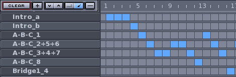 Now we can build up quickly the remaining parts of the song: after this bridge there is another verse, then a bridge and a chorus, which are mostly the same so we just need to create different pattern in a few cases (along with this guide you will find the song file with the whole song). Of course one can write as many lines in the Song Editor as the bars in the song but a whole song would become difficult to follow, plus the songfile would be bigger.