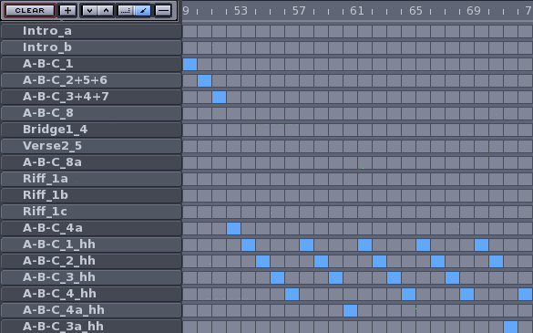 In Fig. 10 here is how is the section in the Song Editor of the two verses and the bridge following the first riff; as you can see the first bars (48-50 according to the Song Editor's enumeration) are already written before while the others (51-71) are new. Moreover there a few pattern 'ad hoc' identified by A-B-C-3a_hh (Fig. 11 to see an example) and A-B-C-4a_hh since both have a few changes not present in any pattern written up to now.